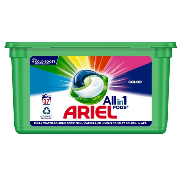Ariel All in 1 Pods Color представлява перилен препарат, който предоставя отлични почистващи качества, осигуряващ дълготрайна свежест и безупречна чистота на вашето пране. Изключително малките по размер, но силно концентрирани капсули, подсилени с високоефективни ензими гарантират мощно изпиращо действие дори и при най-упорити замърсявания, формулата на гела прониква във влакната и премахва петната, като запазва цветовете на тъканите ярки и наситени. Уникалният дизайн на капсулата раздела трите различни формули за пране, а иновативният им слой се разтваря напълно при контакт с вода и освобождава мощната им почистваща сила, която се бори с трудни за отстраняване петна и миризми, благодарение на правилното дозираното количество детергент. Ariel All in 1 Pods Color Гел капсули са удобни и практични за употреба, не изискват дозиране, лесно се съхраняват и дават отлични резултати дори при 30 °C.