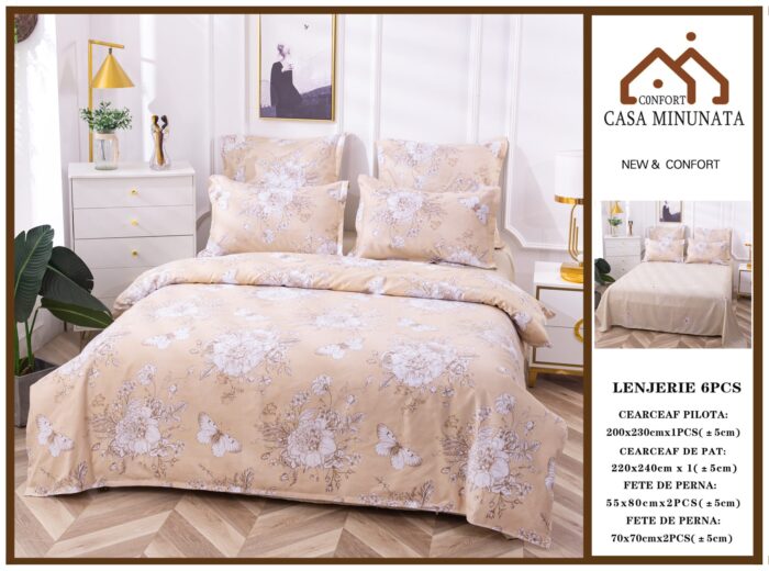 Спално бельо от Фин памук, за Двойно легло, 6 части, 220х240,бял на цветя ,Casa Minunata