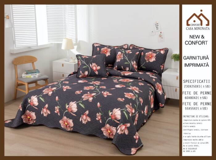 Кувертюра + подарък 4 калъфки за възглавници, от Фин памук, за двойно легло, 5 части,розови цветенца, Casa Minunata