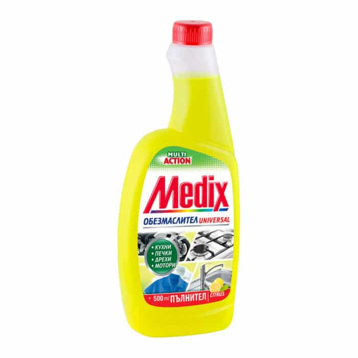 Концентриран обезмаслител Medix Multi Action е с мощно действие и свеж цитрусов аромат. С мултифункционално приложение, като едновременно е безопасен за тъканите и повърхностите. Почиства до блясък, като премахва без никакво усилие мазнини от различни повърхности в кухнята и градината и дори петна по тъкани.