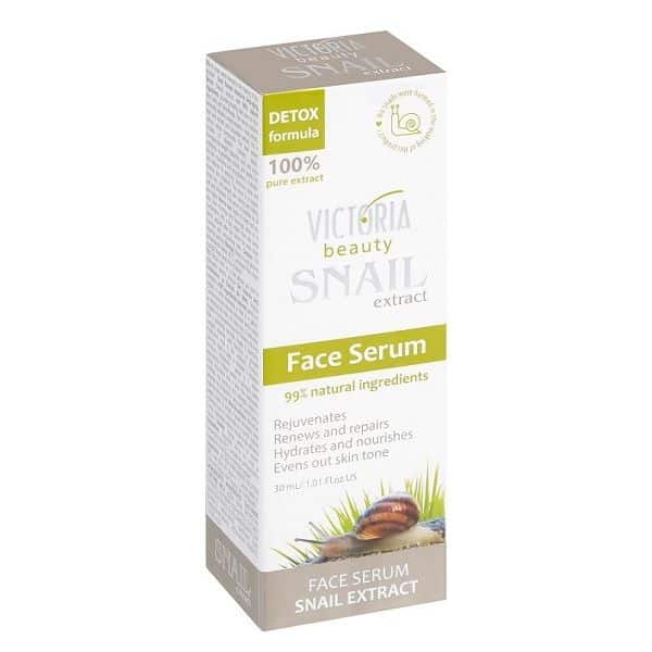 Victoria Snail Extract Face Serum представлява серум за лице с екстракт от охлюв, специално предназначен за интензивна подмладяваща грижа за кожата. Формулата на продукта съдържа 99% натурални съставки и е подходяща за всички типове кожа. Вложените екстракт от градински охлюв, екстракт от алое вера и краставица са богати на разнообразни и ценни активни съставки. Екстрактът от охлюви, съдържа високи концентрации на витамини, алантоин, колаген, еластин и нискомолекулна хиалуронова киселина и фито антибиотици, той взаимодейства със свободните радикали и стимулира естествените регенериращи процеси, в резултат на което кожата се възобновява, подобрява се нейната плътност, здравина и еластичност. Victoria Snail Extract Face Serum премахва тъмните петна и успокоява раздразненията по кожата и оставя усещането за свежест и мекота. Деликатната текстура на серума е лесна за нанасяне и приятна за употреба. След използване на серума от Victoria, кожата на лицето е гладка и стегната, с копринена мекота и сияйна вид.л