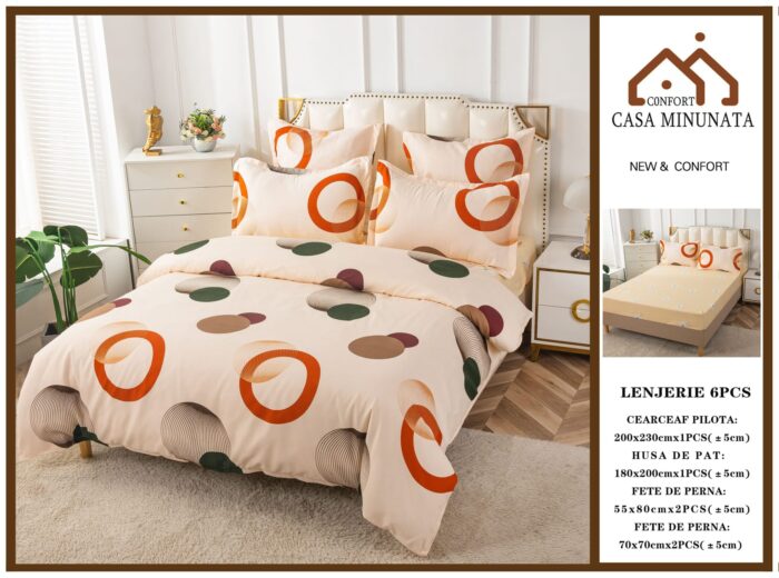 Спално бельо от Фин памук, с ластик, за Двойно легло, 6 части 180х200,бежов с кръгчета ,Casa Minunata