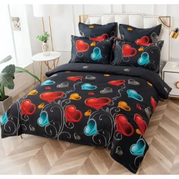 Casa Minunata – Set de lenjerie de pat din 6 piese cu elastic, 180×200, negru pe inimioare multicolore