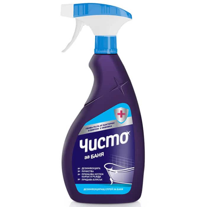 Спрей за баня с бактерицидно и фунгицидно действие; Дезинфекцира; Почиства; Премахва котелн камък и ръжда; Придава блясък; ОБЛАСТИ НА ПРИЛОЖЕНИЕ: Дезинфекциращият и почистващ препарат ЧИСТО за БАНЯ с високоефективната си формула гарантира искряща чистота във вашата баня. Плътната и гъста пяна лесно се задържа върху вертикални повърхности и идеално отстранява упорити замърсявания като котлен камък, ръжда, петна от сапун и други върху вани, мивки, душ кабини, плочки и батерии. Предназначен за дезинфекция и почистване на киселинно-устойчиви повърхности (плочи, хромирани арматури, порцелан, благородна стомана, елоксал, каучук). Не е подходящ за естествен камък (мрамор), алуминий, месинг, мед и емайли, чувствителни спрямо киселини.Оставя блестящи повърхности и свеж лимонов аромат. Улеснява последващо почистване.